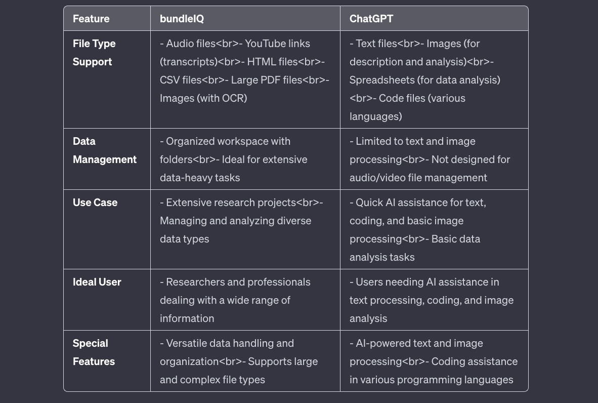 In the rapidly evolving world of digital knowledge management and AI-assisted learning, two platforms have emerged as notable players: bundleIQ and ChatGPT. Both offer unique capabilities in handling various data types and facilitating knowledge management, but they cater to different user needs and preferences.