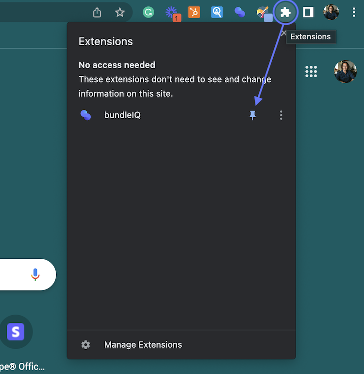 Perform a semantic search against your Notion data: Install the bundleIQ Chrome Extension, click the puzzle icon and pin the extension to the toolbar (reference screenshot). Click the bundleIQ icon to perform a search. Note: It takes about 20 minutes to start seeing Notion results after syncing your account.