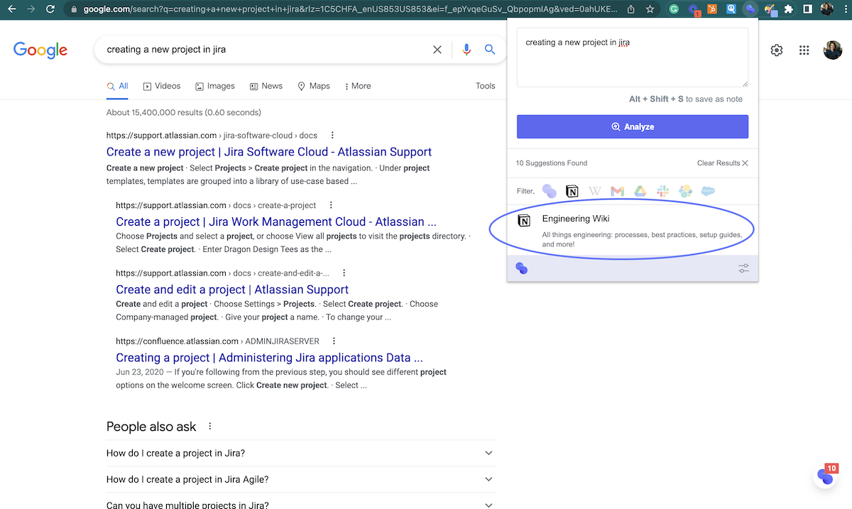 With the bundleIQ chrome extension, you can access your Notion data from anywhere. When performing a Google search, you'll see the bundleIQ widget show up in the bottom right hand corner of the screen. Additionally, you can click on the extension in the toolbar and perform a semantic search.